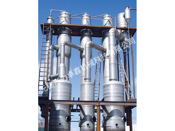 工作原理:四效降膜蒸發器需濃縮的料液由泵送入加熱管頂部,沿著加熱管內壁形成液膜向下流動。在這個過程中,由于管外的加熱,管內液膜開始沸騰并部分蒸發
